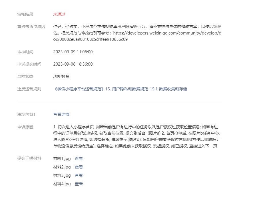 两次申诉违规内容详情图片都是说我们小程序一开始加载就获取位置授权, 实际第二次申诉时已修改, 是不是审核的时候没有刷新看到的还是老代码? 二次申诉后想再申诉的入口都没有?!找人工客服反馈, 要求提供整改方案也提供了, 初步认为没问题, 转交有关部门审核, 要我们等几个工作日, 会在站内信通知, 一直到现在没有结果; 请问, 等了这么久还要让我们等到什么时候呢? 还有其他什么方式沟通解决这个问题?