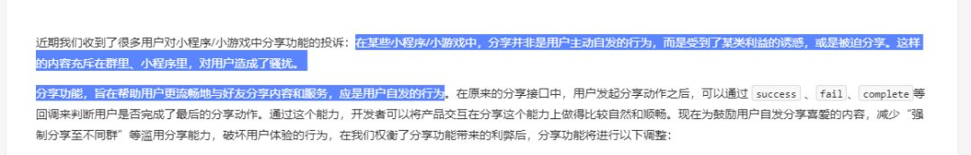 分享涉及到的代码就这一块 分享成功后没有任何操作 并且也没有强制用户分享或者诱导用户分享之类的操作 我想知道我应该怎么修改才可以