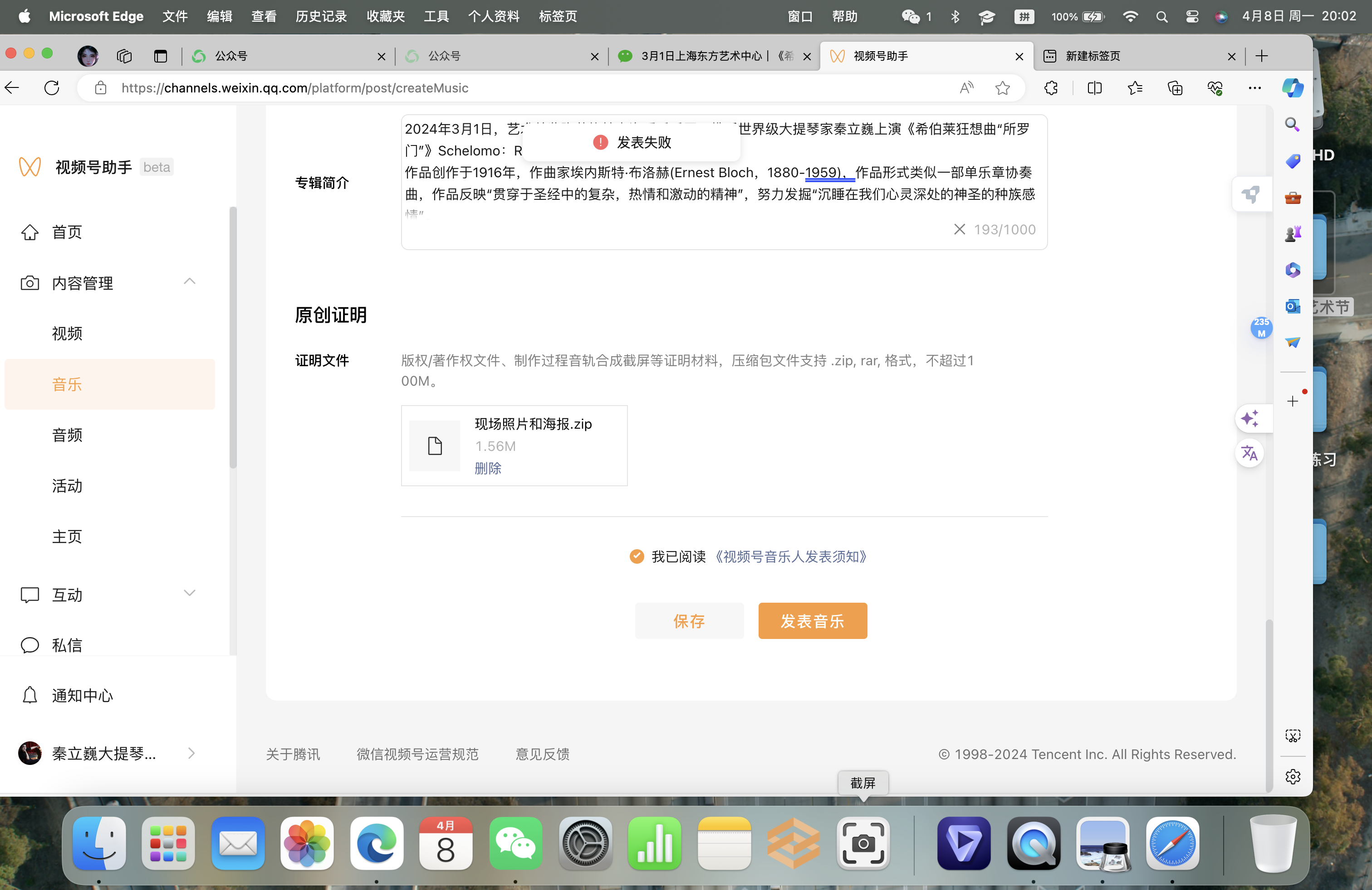 请问我使用视频号助手,发表音乐,为什么总是显示不能发送,也不能存储 微信18653261610