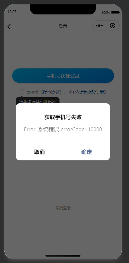 确认过,用户登录的手机号与微信绑定的手机号一致。问题场景:点击button组件后,直接报错,并未出现选择手机号那一步。