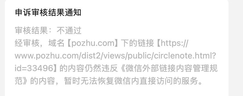 www.pozhu.com域名多次申诉都提示当前链接违反管理规范,事实上该链接早已经下架处理了;