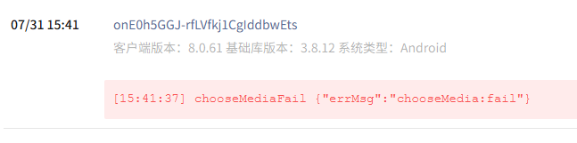 有客户反馈选择图片错误,经过日志监控发现chooseMedia的fail回调只有“chooseMedia:fail”,没有返回错误码