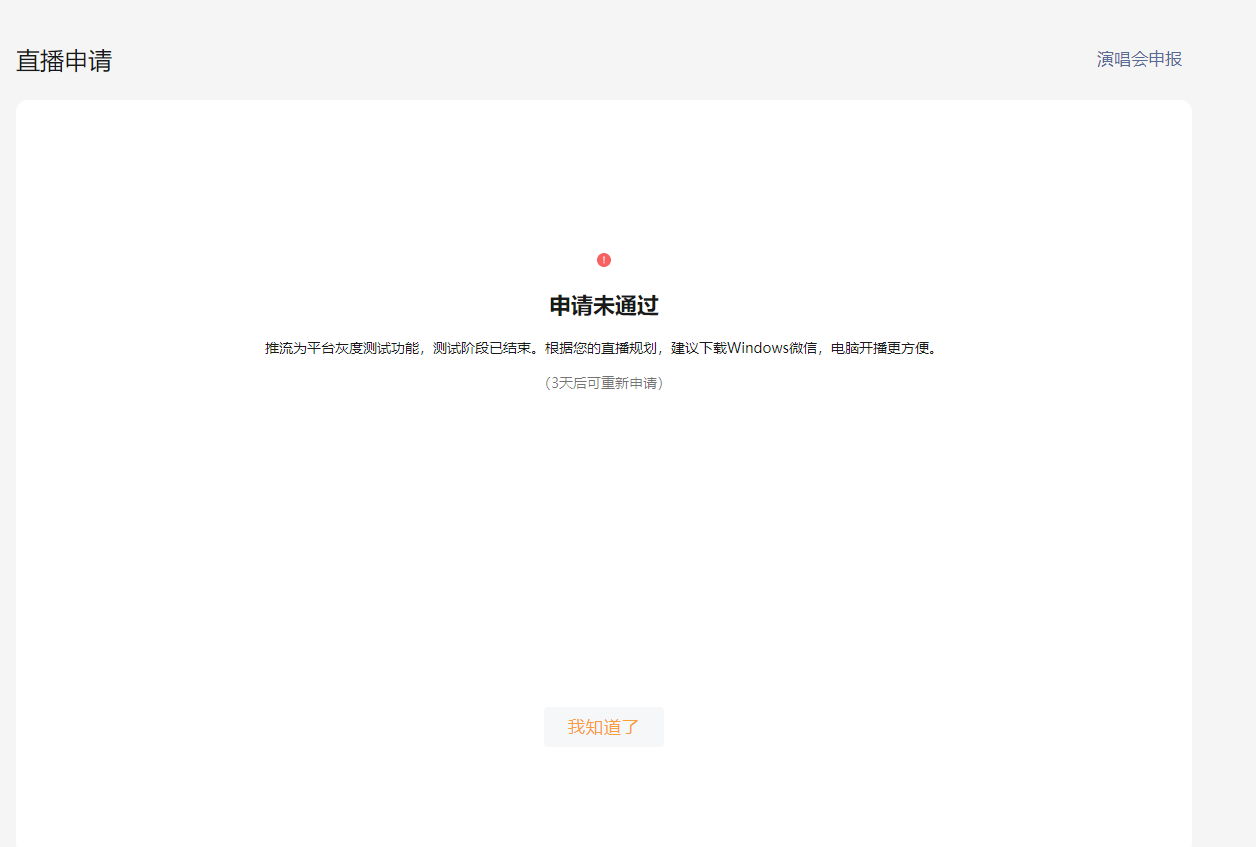 有没有碰到这种,申请未通过,推流为平台灰度测试功能,测试阶段已结束。