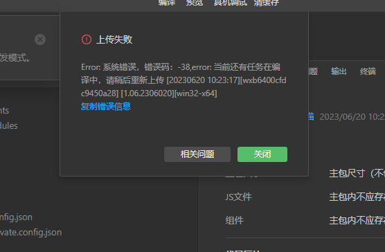 message:Error: 系统错误,错误码:-38,error: 当前还有任务在编译中,请稍后重新上传 [20230512 13:53:54][wx275612db9c63ef9a]