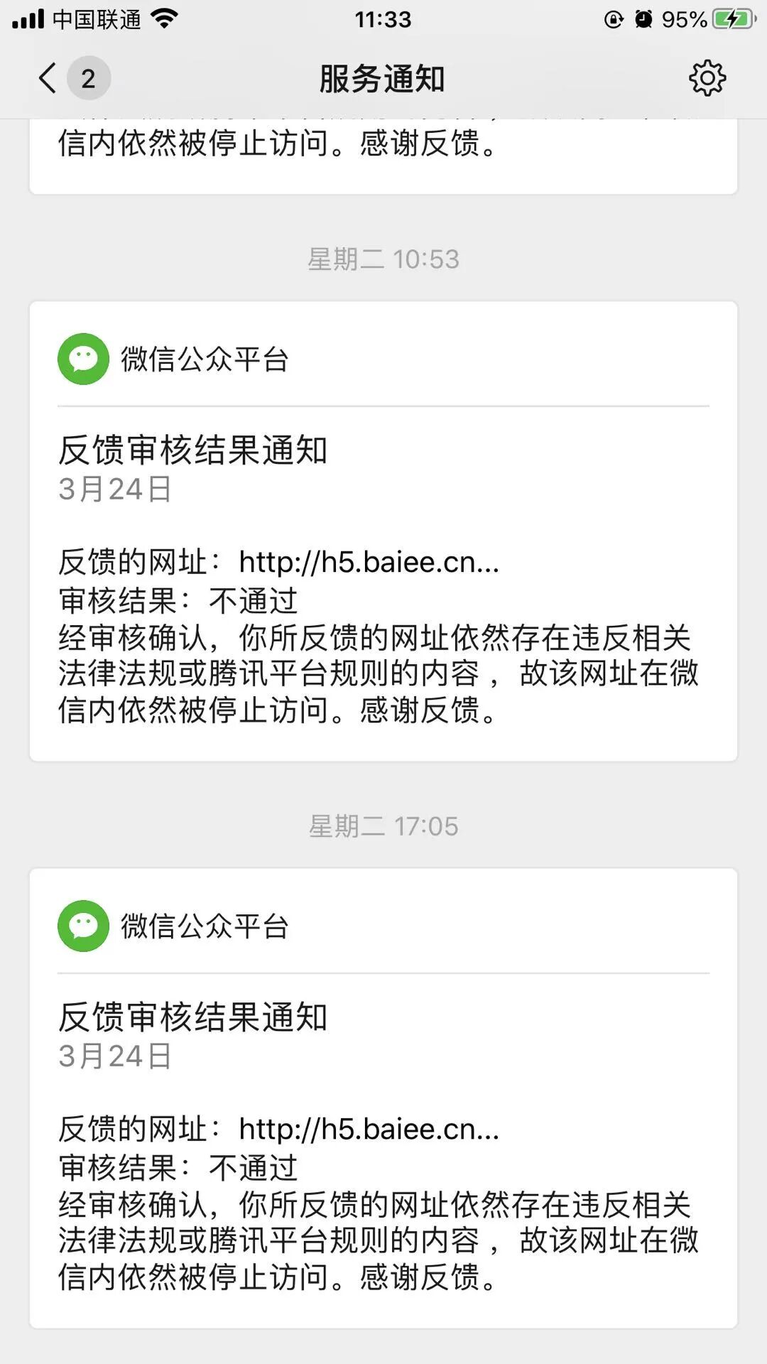 你好,经核实域名baiee.cn下的链接【https://h5.baiee.cn/calAi/cal_bazi?type=79&infoId=553290&orderId=213264608683786240&shareCode=U1UQ85YM&from=singlemessage&isappinstalled=0&openId=oIWP45i225KRUHd32mng1cLPylnA&unionId=oSefN1bq7rRsAZfKG5uQzHX6-AfM&nickname=%E6%96%B0&sex=1&avatar=http%3A%2F%2Fthirdwx.qlogo.cn%2Fmmopen%2Fvi_32%2FSn7BGlKmuYn42qic4I4FiaNhJgyxFQqFKWsRGUVaNwnULic9K4RsiaU5X7nokWqV2D75cicYNicV5ZNIE3yiab8Yic2fhQ%2F132】存在测试类违规,不予解封,知悉。