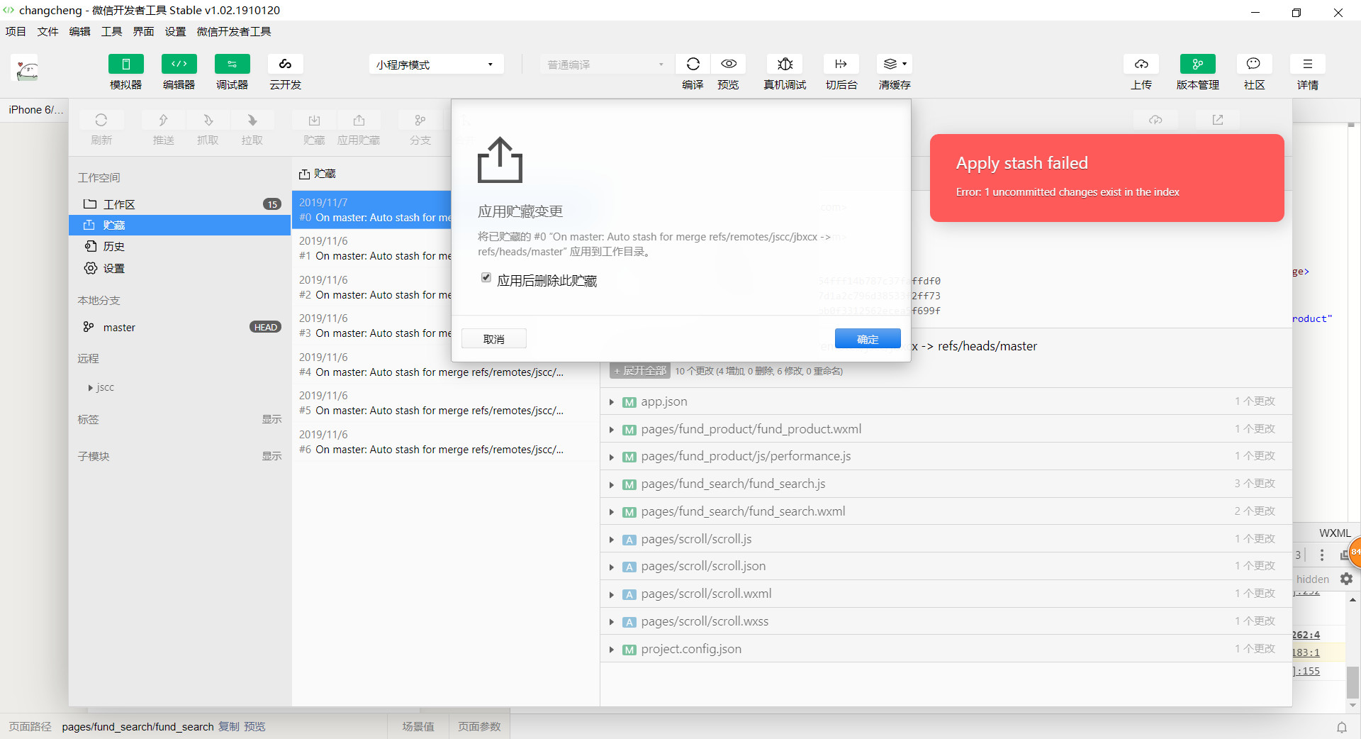 参考下这个回复:代码管理,贮藏后,代码不见了,应用贮藏的代码失败了,怎么搞?? HS 的回答 - 微信开放社区 https://developers.weixin.qq.com/community/develop/doc/0006881610c6408aa969b55ae51000?_at=1573112006356&jumpto=comment&commentid=0006eccdcfc998cbaa694d6b554c