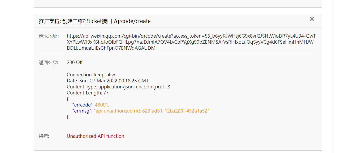 公众号创建临时二维码 报错Unauthorized API function appid 和accessToken 都没问题,而且已经认证? 如图