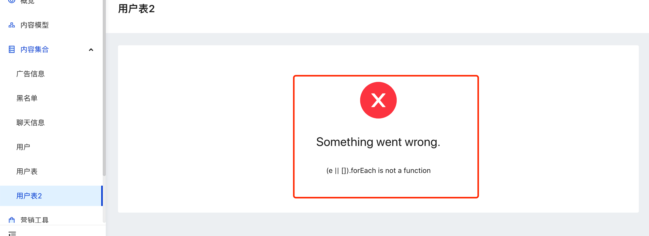 启用了“内容管理”创建“内容规模”后,点击“内容合集”对应的表时,出现了下面报错: