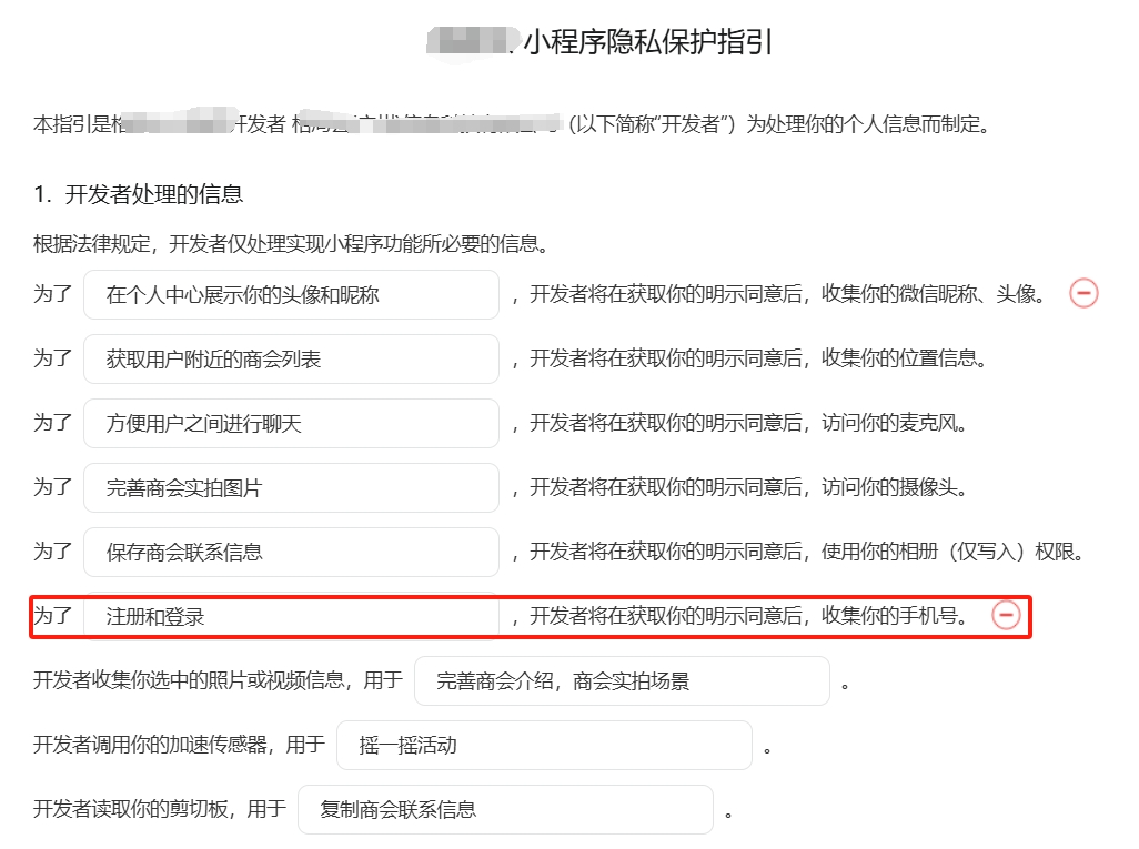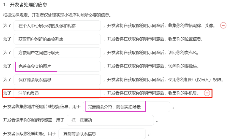 你好,建议针对不同的隐私接口分别详细描述下与其相关的具体用途后重新提交。