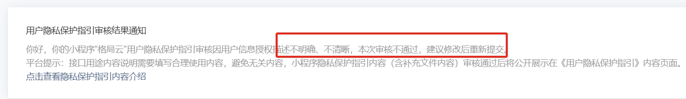 现在开发工具上调试获取手机号都报这个错。非得要完善相关的用户隐私保护协议才给用这个API。这个我我忍了,但是我提交更新隐私协议内容,你倒是给我审核通过呀。你这驳回理由看得我一头雾水的。