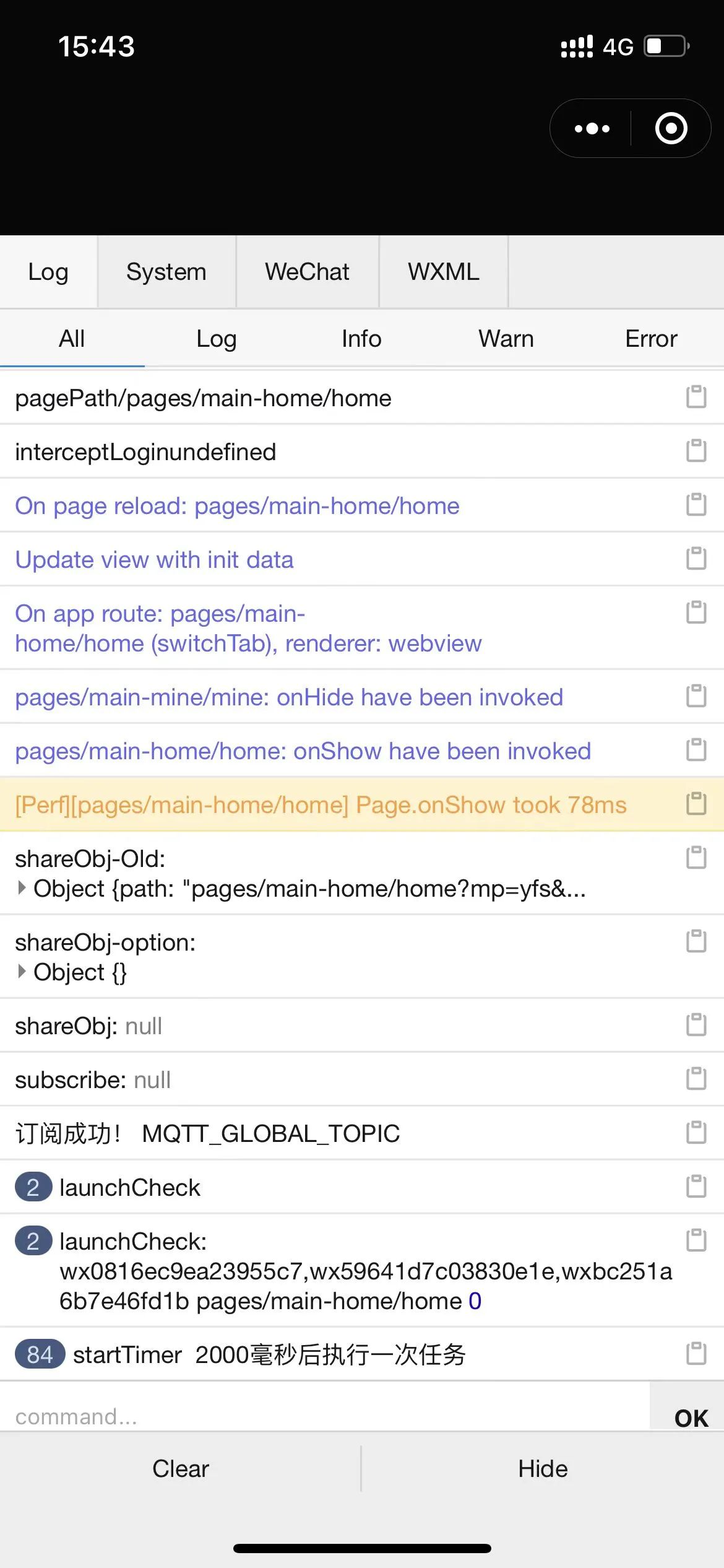 这是一次白屏捕捉的最后Log,紫色的日志提示main-home(首页)中onshow已经被调用。