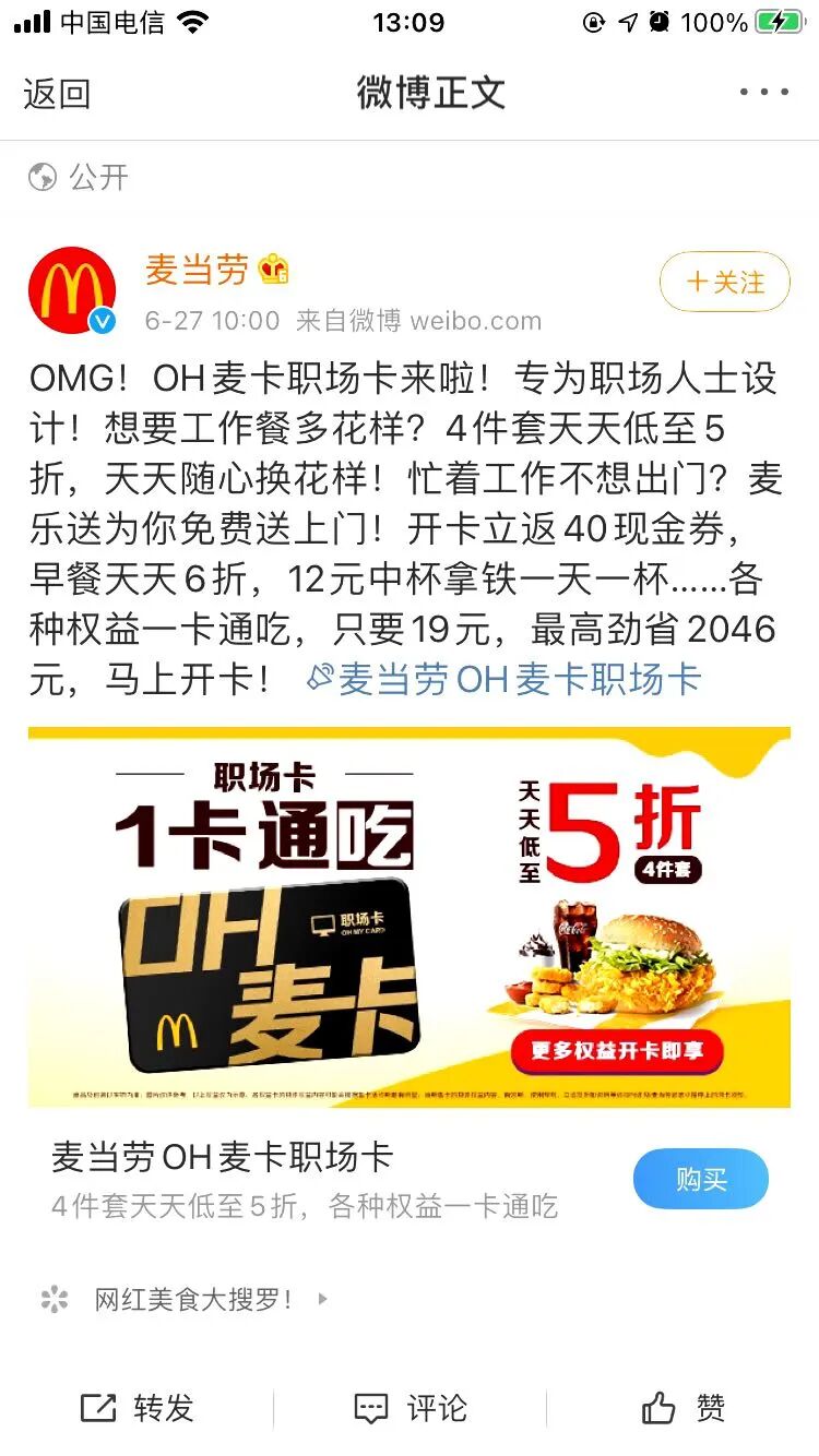 下图中点击“麦当劳OH麦卡职场卡”会跳转至麦当劳小程序的买卡页面