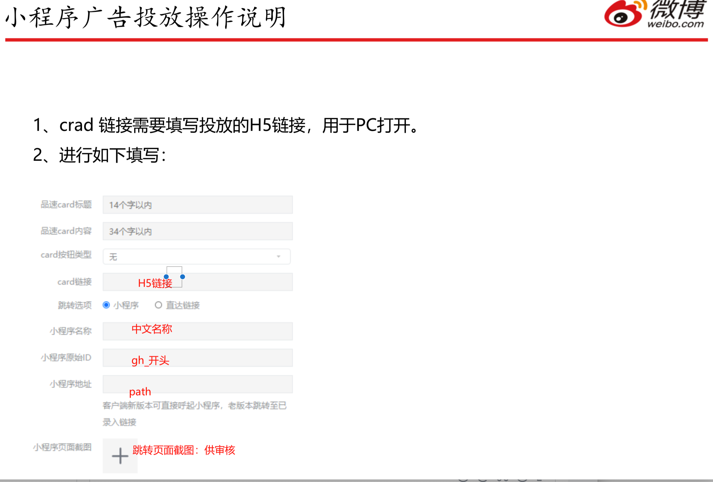 sinaweibo://wbdiversion?url=https%3A%2F%2Fshorturl.biz.weibo.cn%2FA6LQgTi7%3Ff9de8824311c533ba27a502a55a17df2_weiboad&username=原始id&path=小程序路径