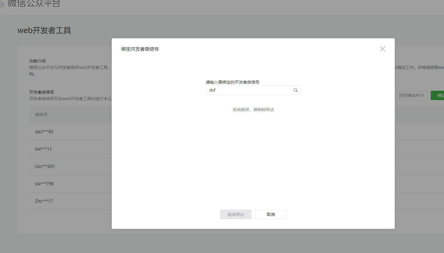 请输入正确的微信号重试看看,如果重现请提供微信号、登录的mp账号和操作时间。我们定位下