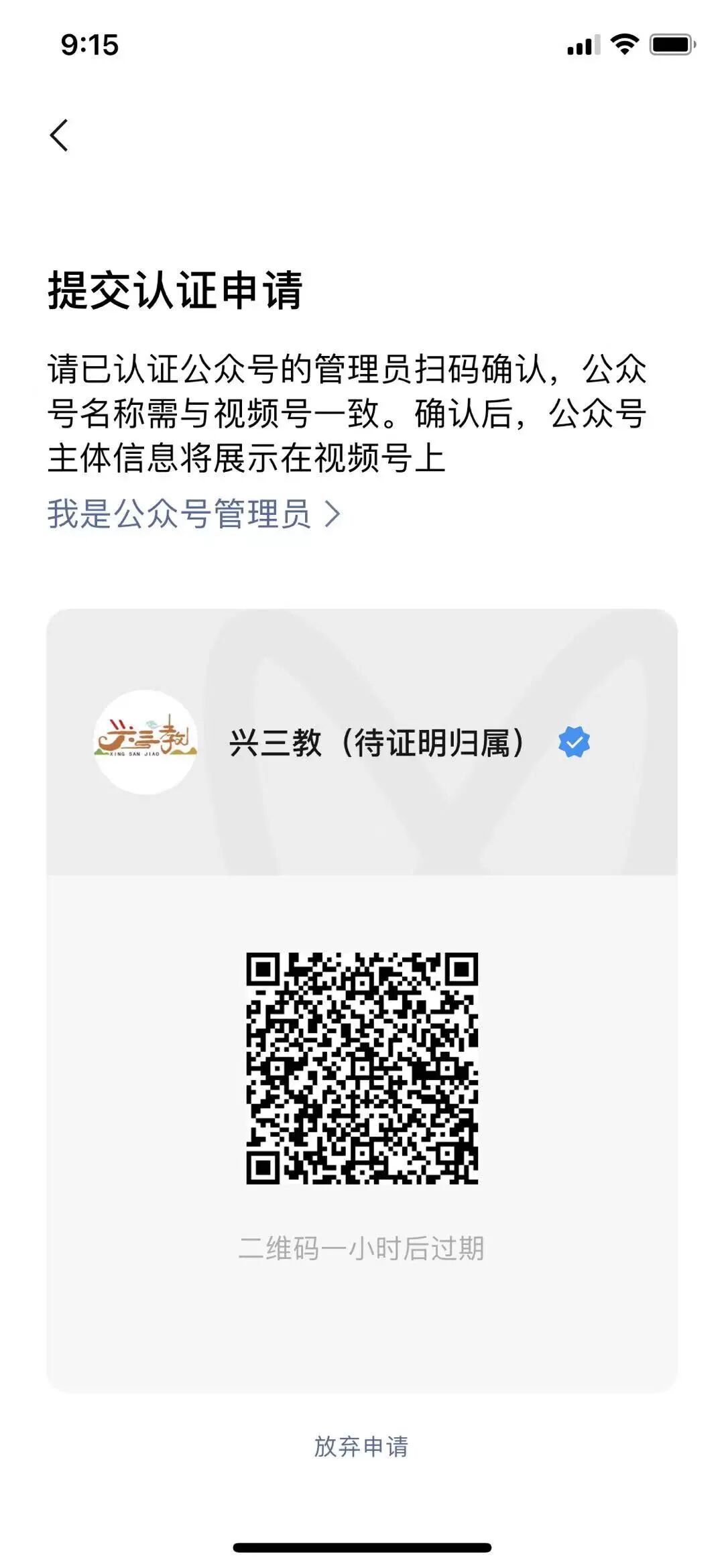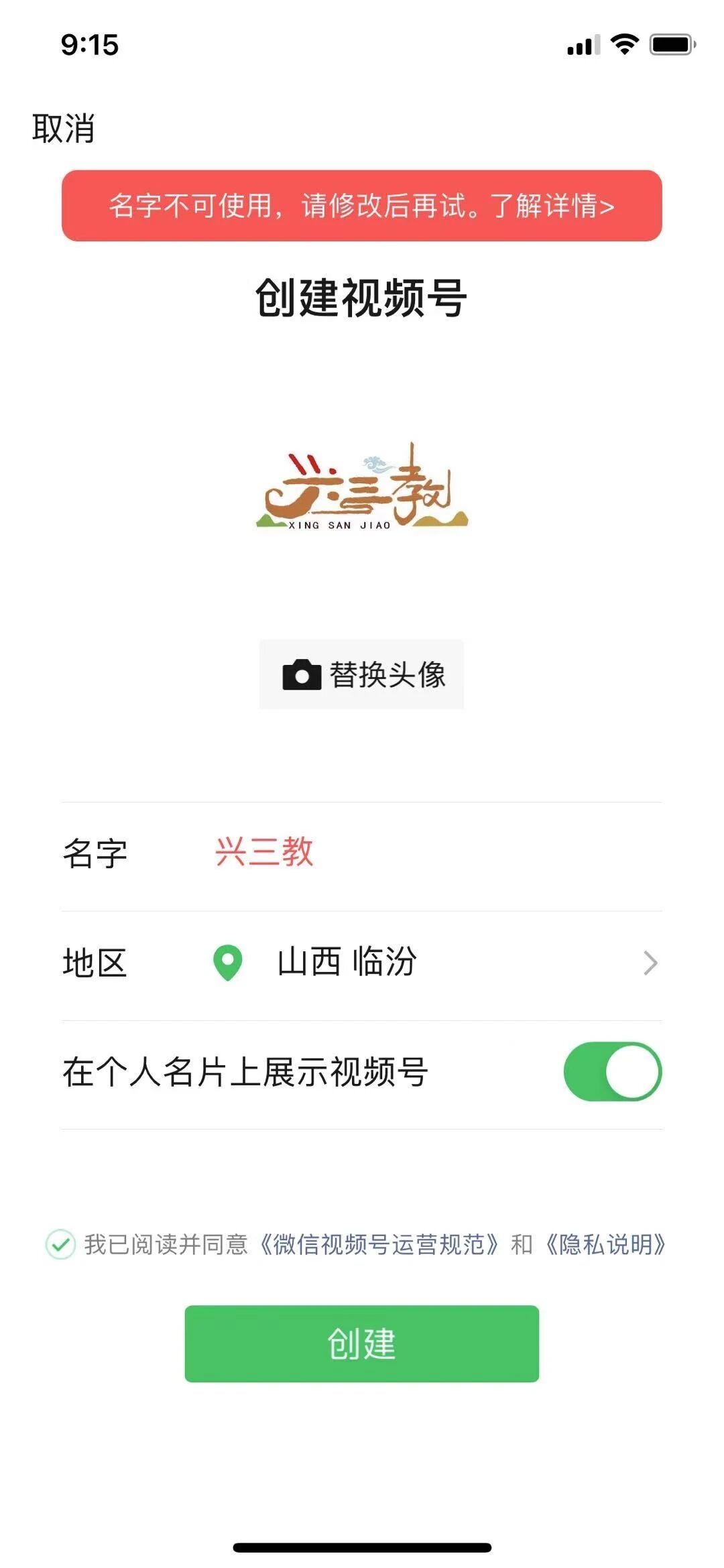 微信视频号创建名称提示无法使用受到保护名称为‘兴三教’,提交资质后(企业公众号管理员扫码后),提示绑定成功,结果还是无法创建,依旧停留在创建视频号的界面,现在公众号已经绑定,视频号还无法创建,没有任何提示窗口,请求帮助!截图如下