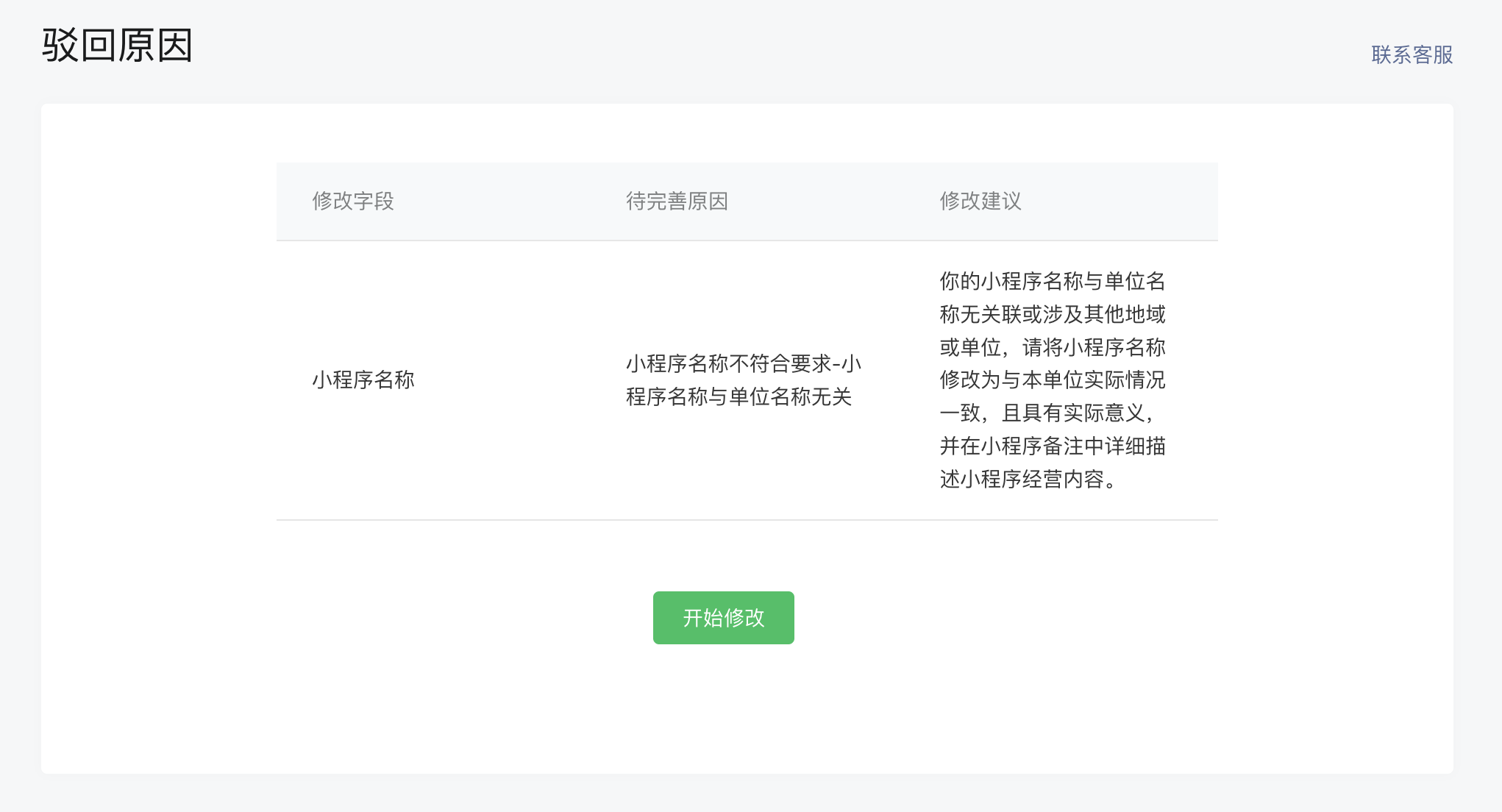 小程序备案初审说小程序名字不含有营业执照名字,修改备案信息时无法修改小程序名字,在哪里改?