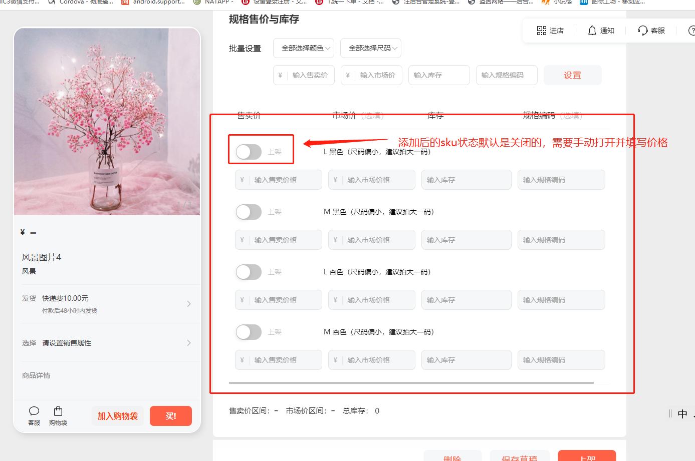 调用微信小商店api:https://api.weixin.qq.com/product/sku/batch_add?access_token=xxxxxxxxx添加sku后 再调用api:https://api.weixin.qq.com/product/spu/listing?access_token=xxxxxxxxx上架商品,上架后的商品无sku信息, 需要在小商店手动勾选属性开关并填写价格库存等信息后点击上架,此时信息才完整,如下图: