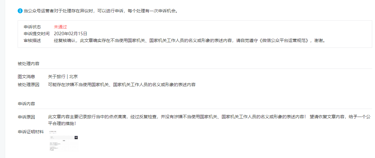 第一次开个人公众号,第一篇发布的推文就被说违反规定,涉嫌不当使用国家机关、国家机关工作人员的名义或形象的表述内容。但是文章只是记录自己旅行的趣事,检查了文章也没觉得有问题,用其他软件检测也说无存在违规内容。