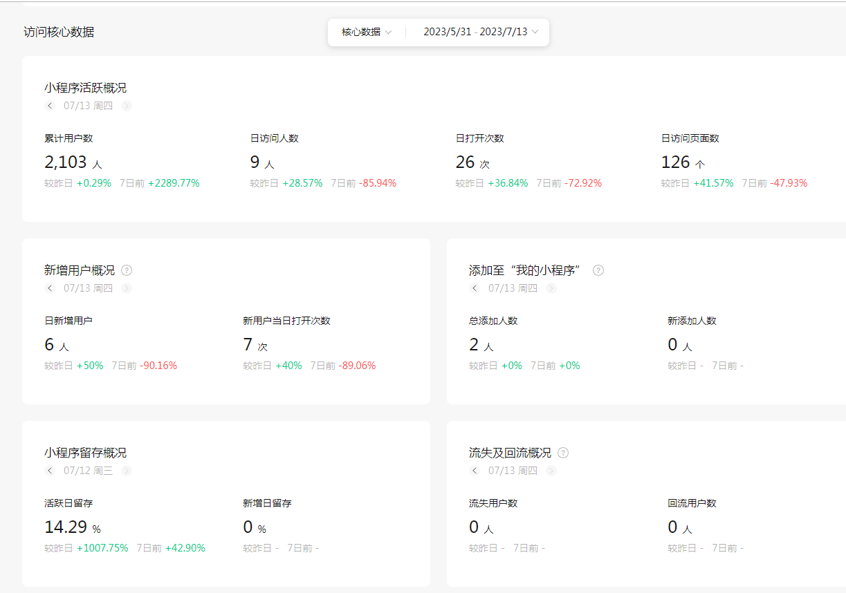 之前平台有6000多粉丝,看一下会员的新增使用情况,小程序一直使用WEB封装的,用起来很是难受,后来一直用公众号网页,这个月重新开发的小程序上架了,绑定过去原来的系统测试一下,你就说我刷粉,我刷粉数据会那么平稳?????