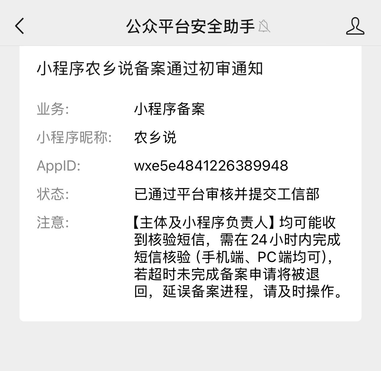 你好,1)当前小程序ID: wxe5e4841226389948的备案订单提示等待用户短信核验,核验对象为订单中的主体负责人;