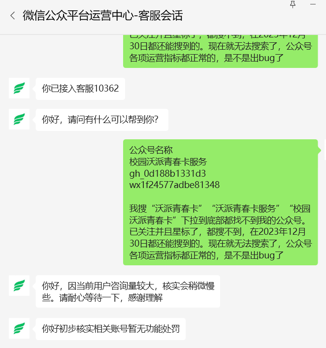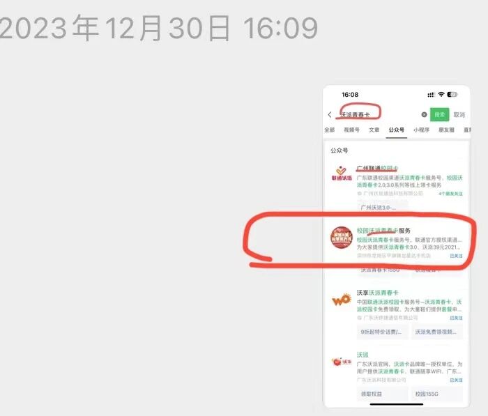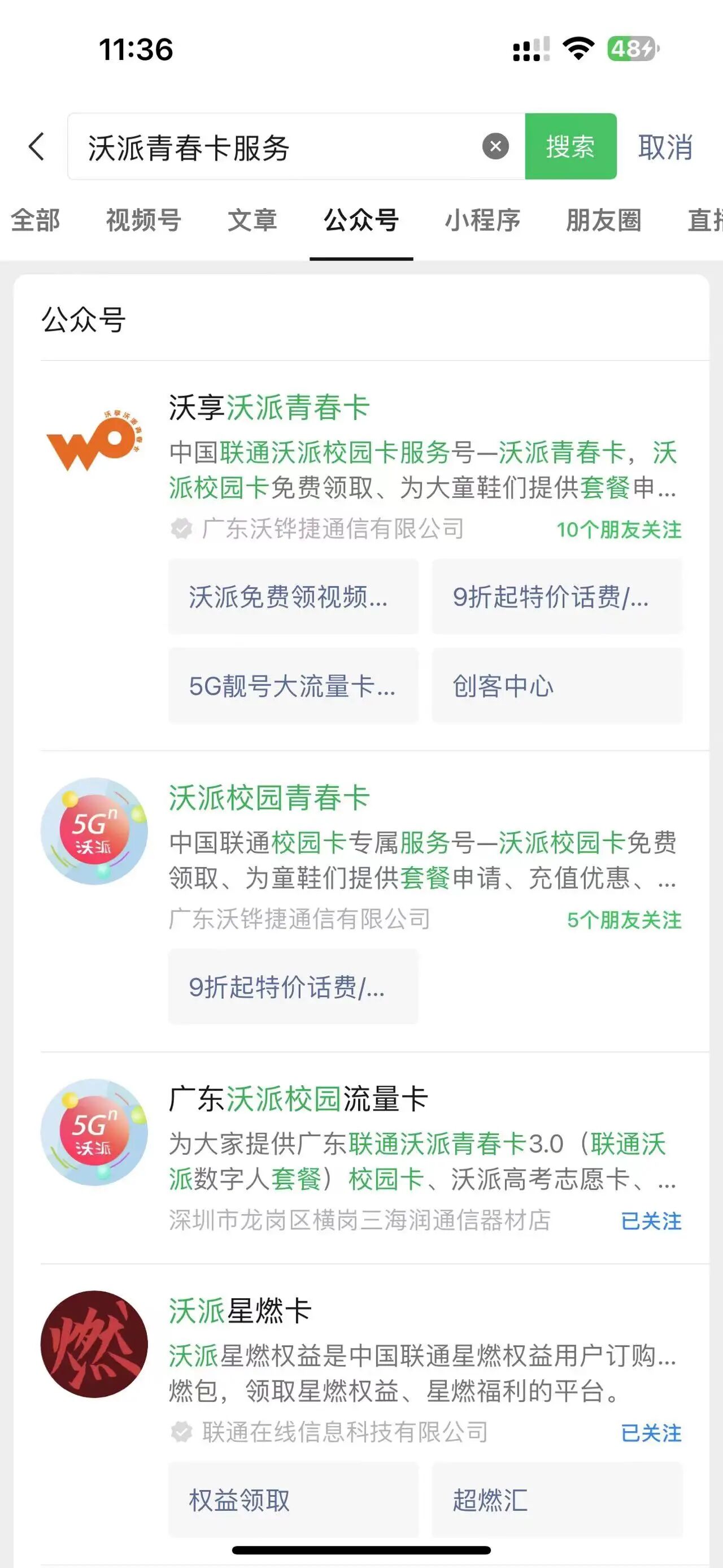 我搜“沃派青春卡”“沃派青春卡服务”“校园沃派青春卡”下拉到底部都找不到我的公众号。