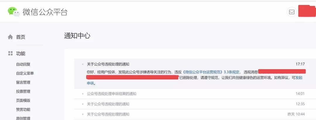 2、希望今后微信公众平台每次的违规处理,能提供简要说明,至少有违规部分截图作为证据。