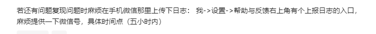 若还有问题复现问题时麻烦在手机微信那里上传下日志: 我->设置->帮助与反馈右上角有个上报日志的入口,麻烦提供一下微信号,具体时间点(五小时内)