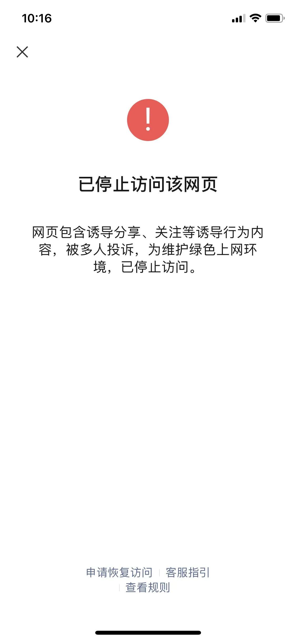 你好,经核实,域名sunzhiwei.cn下的链接:【http://sunzhiwei.cn/?cy=a44a8WVYNoA3Ez3s5rvpMtNw62kipGuUvxFvWXaFqN1cWiih&ppt=cc#】的内容违反《微信外部链接内容管理规范》,不予恢复微信内直接访问的服务,请知悉。