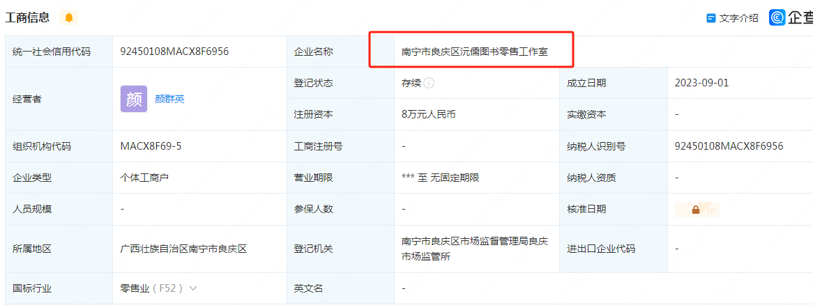 名称:南宁良庆区沅儒图书零售工作室(个体工商户)
