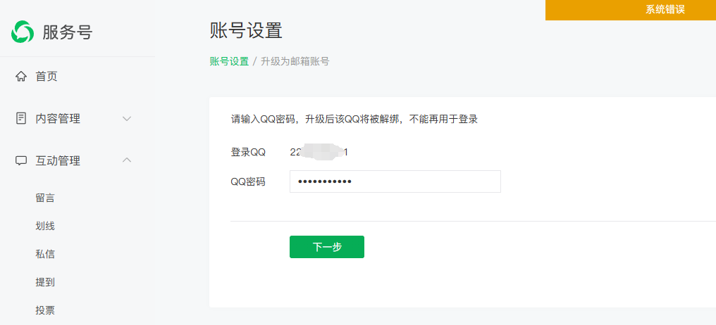 十几年前注册的服务号需要找回密码,但此服务号登录账号是qq号不是邮箱号,于是去升级登录账号为邮箱,点升级的时候却提示“系统错误”。目前找回密码需要邮箱格式,升级邮箱格式却报系统错误,陷入死循环了。请安排专人与我对接此bug,以便尽快修复,谢谢!