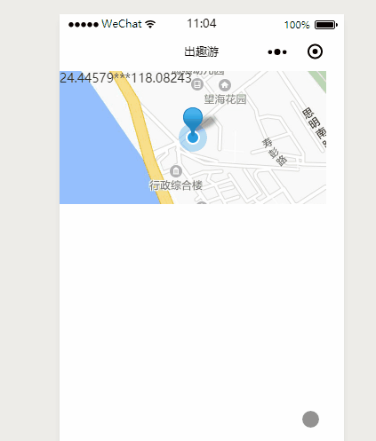<map id="map" latitude="{{lat}}" longitude="{{lng}}" markers='{{markers}}' bindregionchange="moveMap" show-location> <cover-view class="text">{{lat}}***{{lng}}</cover-view></map> |
