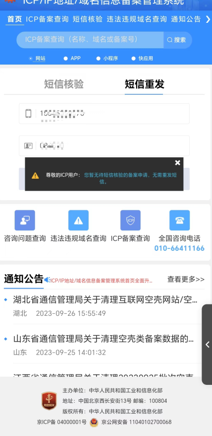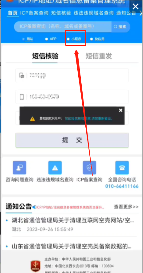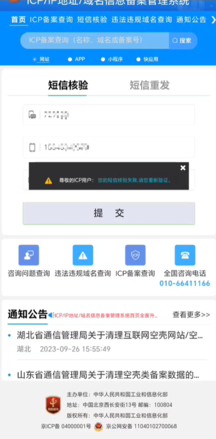 已经收到了工信部的验证码,但是提交验证失败,已经确认手机号、验证码等信息没填错