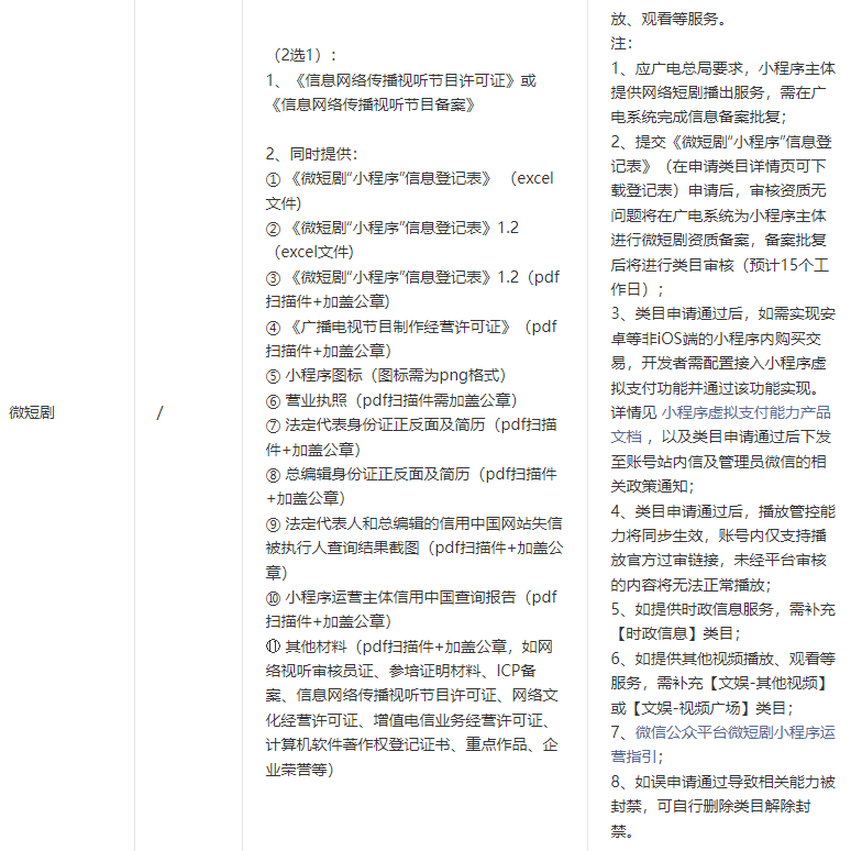 你好,小程序涉及【文娱-微短剧】类目,需提供的资质如下;因不同服务对应的类目不同,【文娱-其他视频】以及【文娱-视频广场】类目适用于提供视频播放、观看等服务,暂不支持提供微短剧服务。