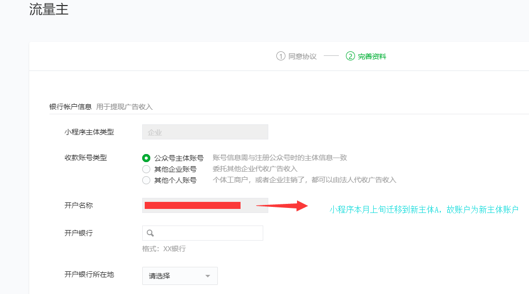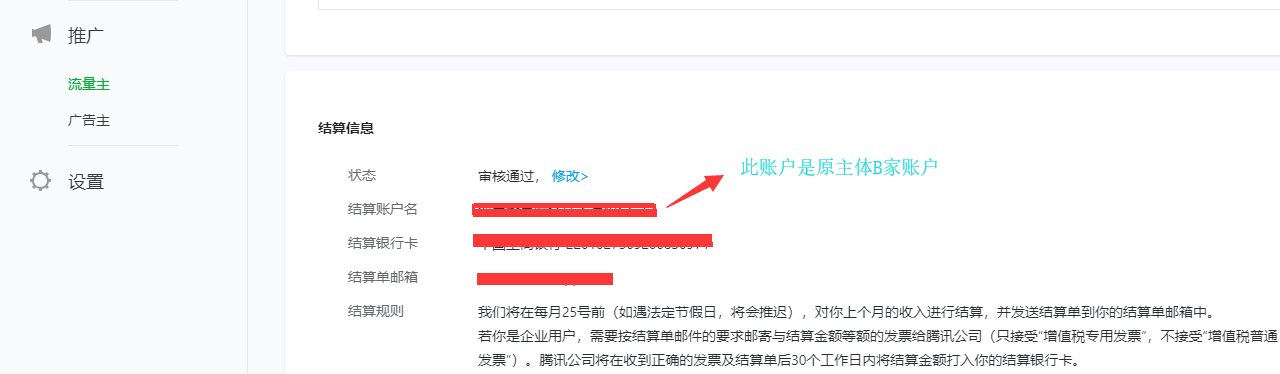 2、流量主收款账号为原主体B账户,因小程序本月上旬成功迁移到新主体A,需要变更流量主原主体B公司的收款账号为新主体A公司。