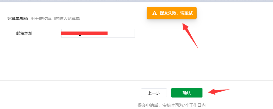 5、资料填写完毕后,点击确认按钮显示:提交失败,请重试。问2:为什么提交失败?