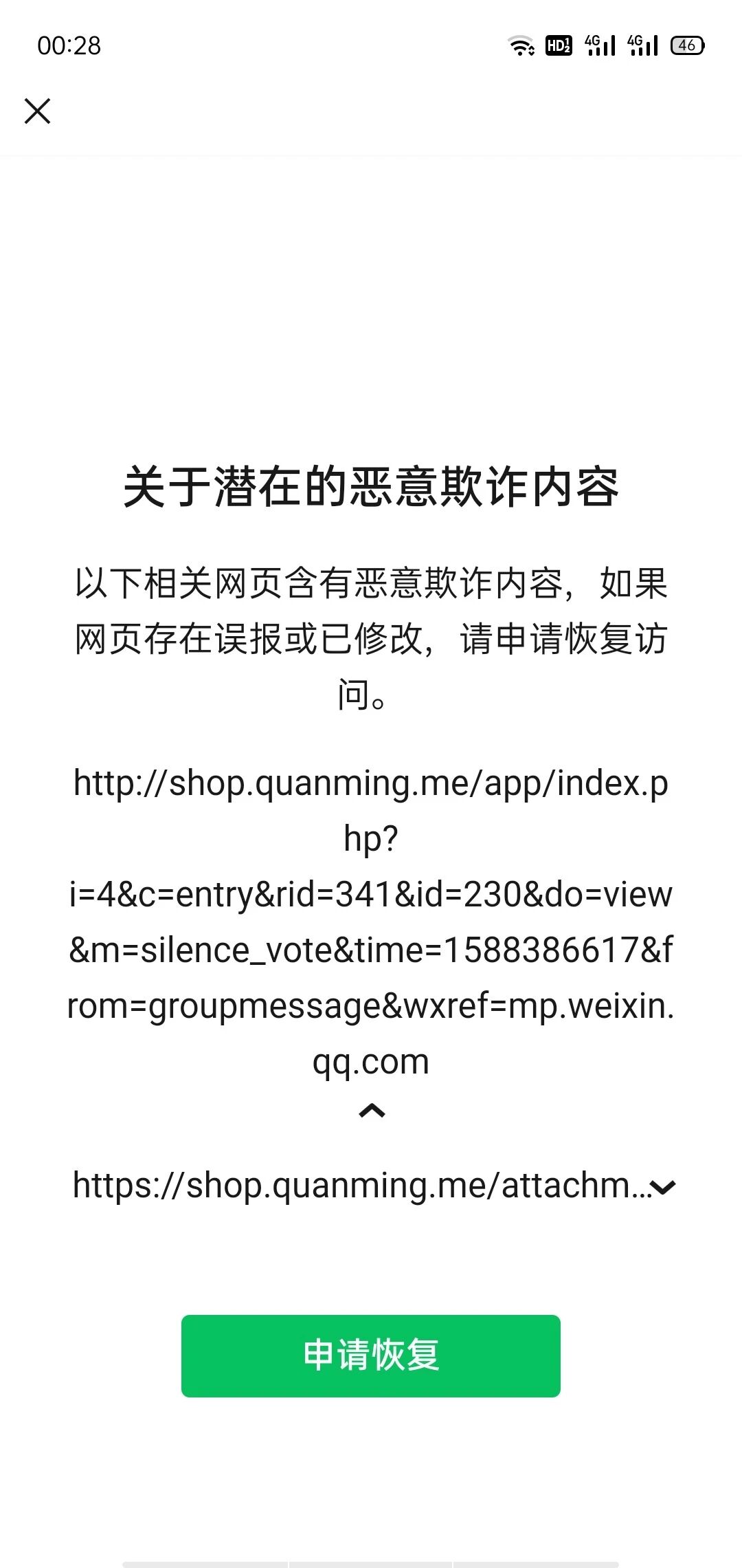 你好,经核实域名shop.quanming.me被手机管家拦截,此处仅处理被微信暂停提供微信内直接访问的服务的外部链接的申诉问题,此服务不在受理范围,请登录手机管家官网【http://gj.qq.com/online_server/complain_url.html】自行申诉,知悉。