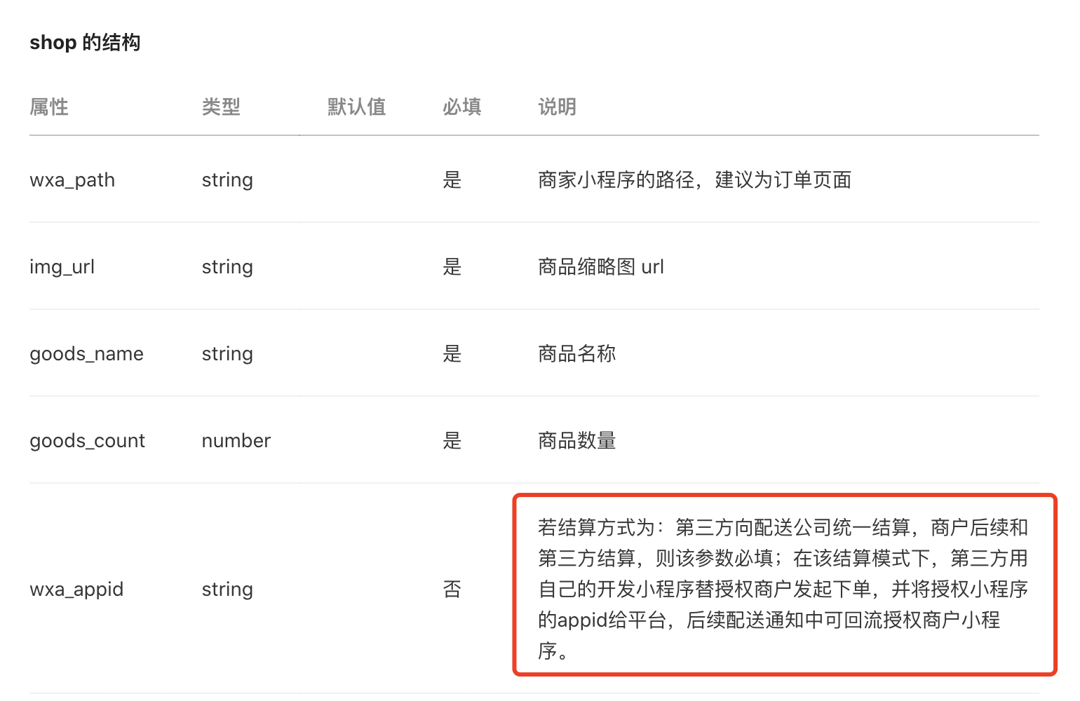 若结算方式为:第三方向配送公司统一结算,商户后续和第三方结算,则该参数必填;在该结算模式下,第三方用自己的开发小程序替授权商户发起下单,并将授权小程序的appid给平台,后续配送通知中可回流授权商户小程序。