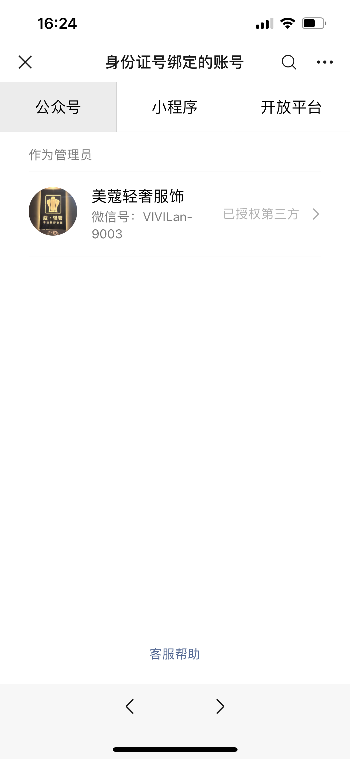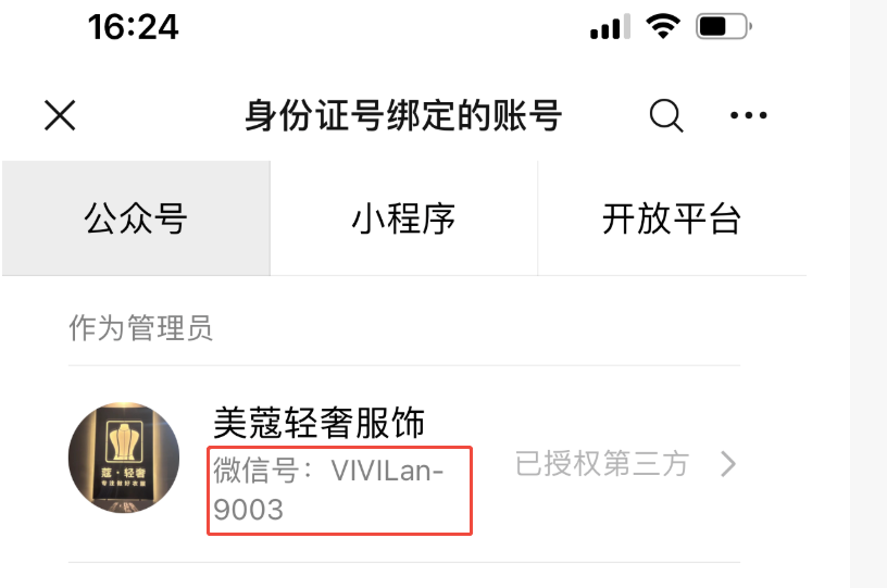 这里显示的微信号不是指微信的【微信账号】,是指公众号里面有个设置叫【微信号】,通过此设置可以输入设置的【微信号】搜索到此公众号。2、可使用以下任意一个方式解除授权的第三方平台:1)、解除授权请参考文档:https://developers.weixin.qq.com/doc/oplatform/Third-party_Platforms/2.0/operation/authorization/authorization_management.html#_3%E3%80%81%E8%A7%A3%E9%99%A4%E6%8E%88%E6%9D%83
