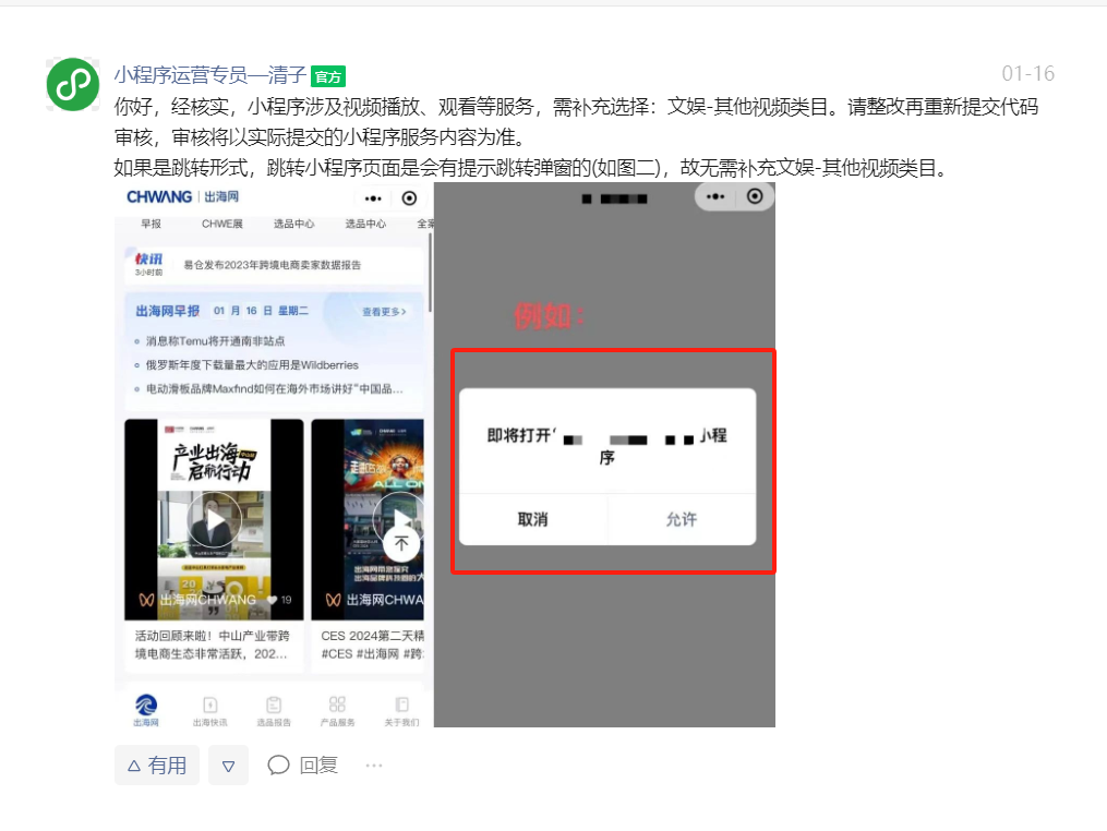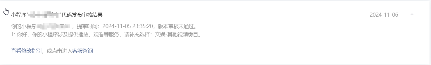 你好,经核实,你的小程序最新版本暂不用补充【文娱-其他视频】类目,但【产品】页面无具体运营内容,建议上架正式内容或商品(非测试)或在提审页面上传小程序完整录屏,再提交代码审核。审核将以实际提交的小程序服务内容为准。