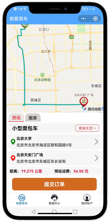 客户打开小程序,发货地点自动定位到客户当前位置。客户只用选择要使用的车型后,打开地图,选择要送货的目的地,系统会自动规划起止线路、计算两点距离并显示预估价格(此价格参数由物流服务公司在后台设定)。客户只用点击提交订单完成下单操作。