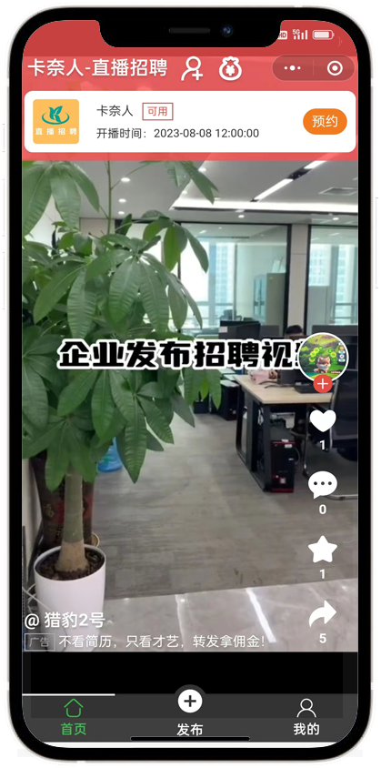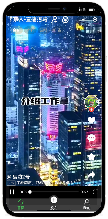做为直播招聘的新平台,让求职和招聘变得更简单!企业发布招聘视频,展现公司环境与实力,开通会员可以直播招聘、在线面试功能;求职者刷视频可以刷到工作,加入会员,发布自己的才艺视频,优先推荐给企业。我们希望Boss亲自面试,求职者也省去来回奔波。你只需简单的转发,不但为朋友推荐工作,还能拿佣金,可谓一举两得。