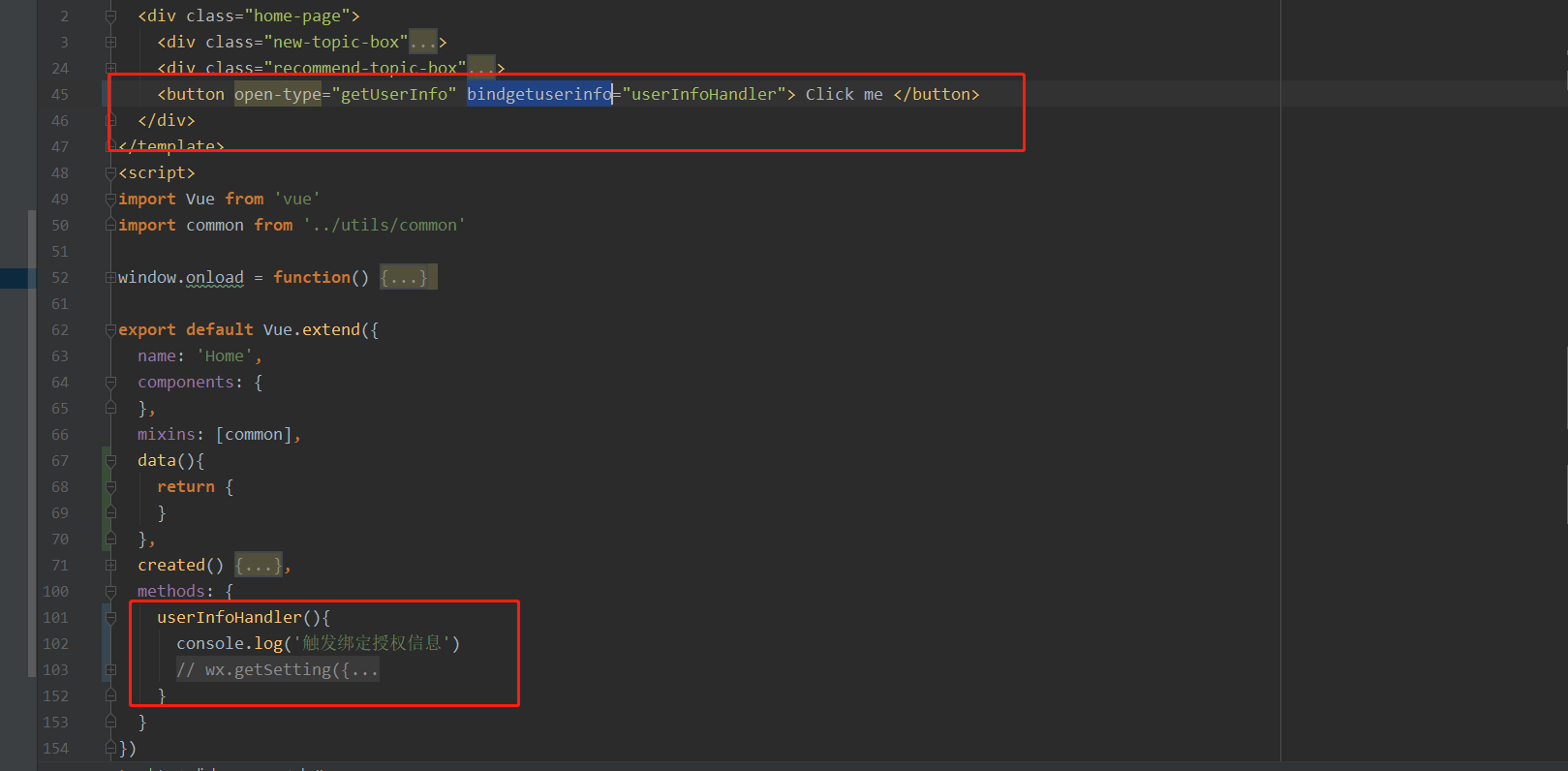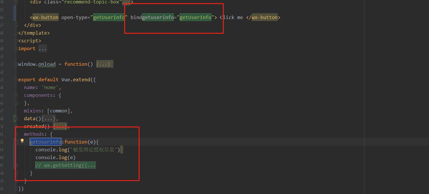 <wx-buttonopenType="getUserInfo"onGetUserInfo={(res) => {console.log(res.detail);}}>点击授权</wx-button><wx-button open-type="getUserInfo" @getuserinfo="bindGetUserInfo"></wx-button> methods: { bindGetUserInfo (e) { console.log(e.detail.userInfo) } }大佬最后是怎么解决的啊,用了原生组件最后没有触发到bindgetuserinfo