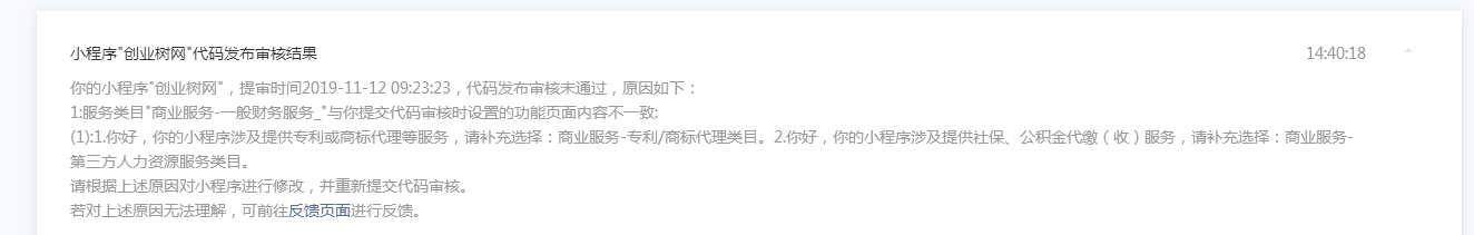 你好,经核实,贵方提供的APPID与上述小程序名称不一致,查看到【创业树网】小程序:1.确实涉及涉及提供专利或商标代理等服务,需补充选择:商业服务-专利/商标代理类目,或请自查代码,确保包括前端展示、小程序代码等整体均移除:相关内容;2.涉及提供社保、公积金代缴(收)服务,需补充选择:商业服务-第三方人力资源服务类目;3.涉及引导办理保险业务,需补充选择金融业-保险类目(详图如下)