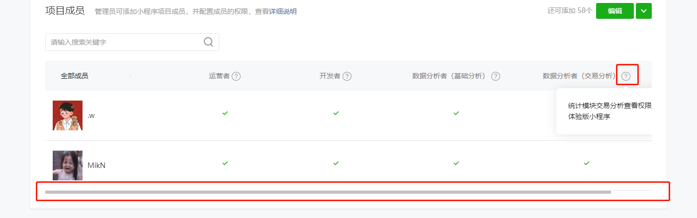 微信公共平台,成员管理页,项目成员栏,数据分析者的帮助问号,鼠标放上去会影响到下方列表样式