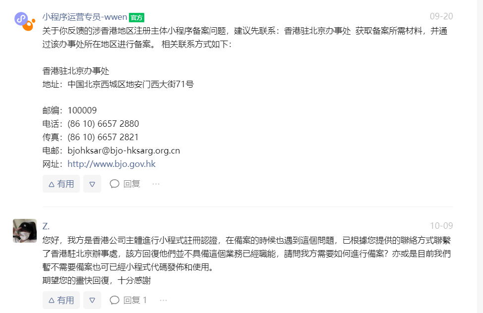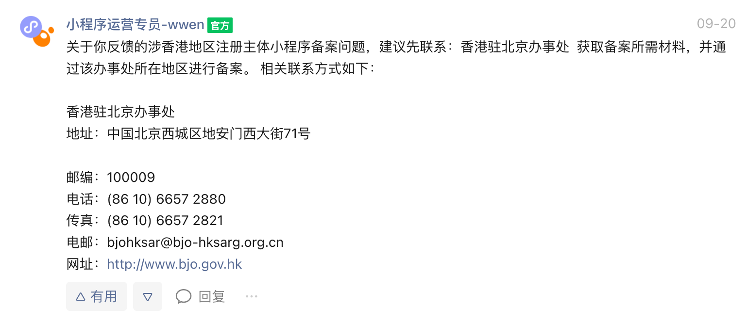 客服说港澳台地区的是不支持的,但提到微信这边让联系香港驻京办事处,客服听了后,说是让联系具体的通信管理局,你打算落在哪个省份,就去咨询该省的通信管理局,看看他们对港澳台主体的小程序在本省备案,应该走什么流程。