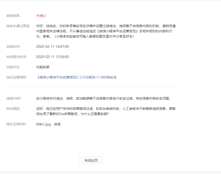 你好,经核实,你的帐号确实存在涉嫌未设置过滤违法、违规等不当信息内容的机制,请自觉遵守国家相关法律法规,不从事违法或违反《微信小程序平台运营规范》及相关规则的内容和行为(可上传违规图片以及违规信息创建活动并分享给好友),谢谢