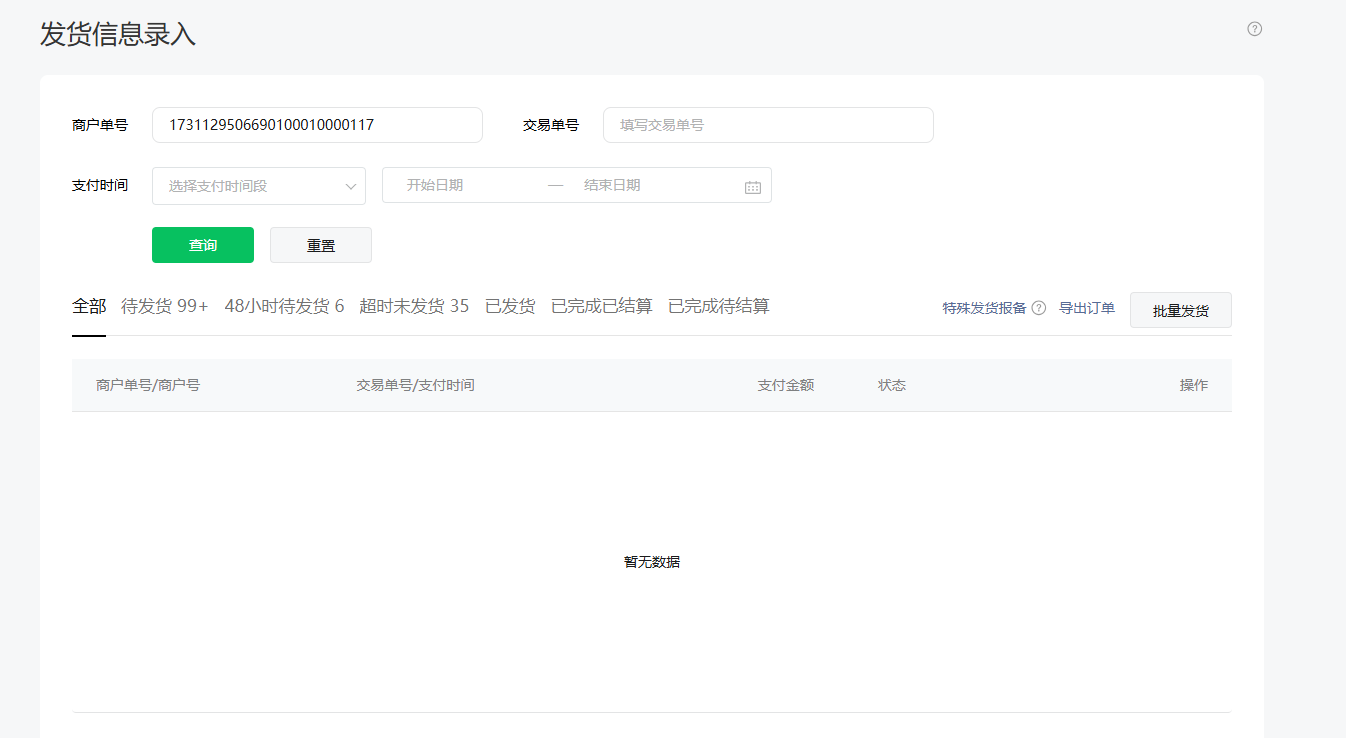 但mp后台查询对应的商户订单号进行发货时显示无数据