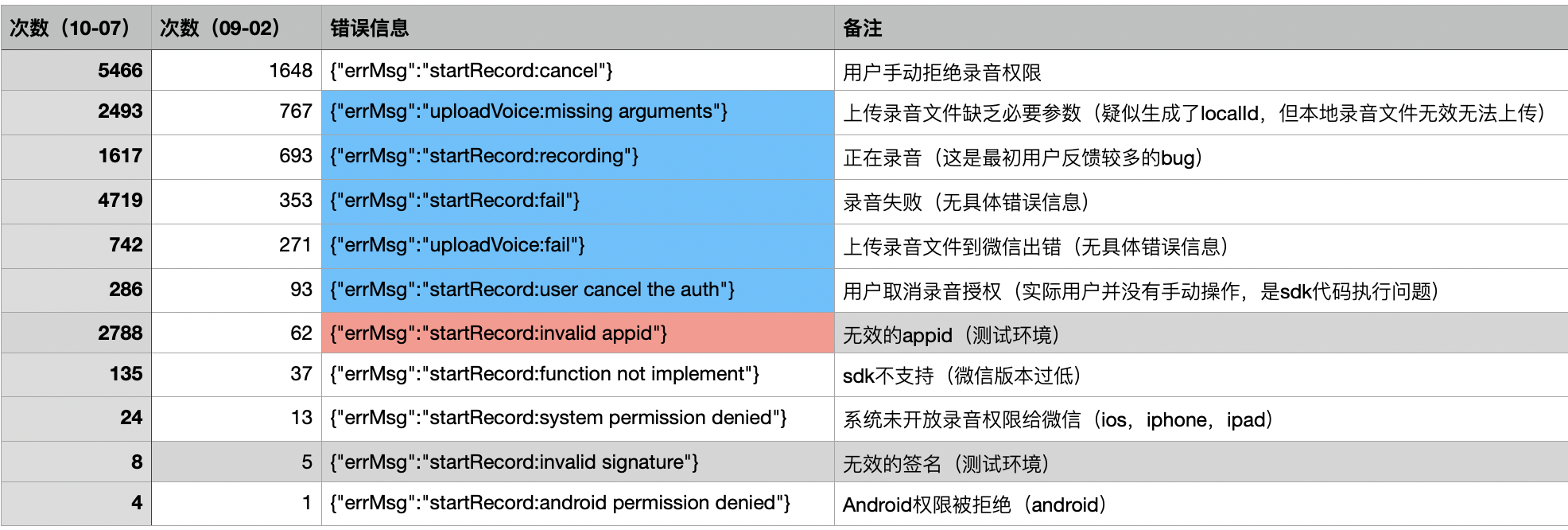 - 上述错误是我们通过jssdk的startRecord、stopRecord的fail回调采集到的。