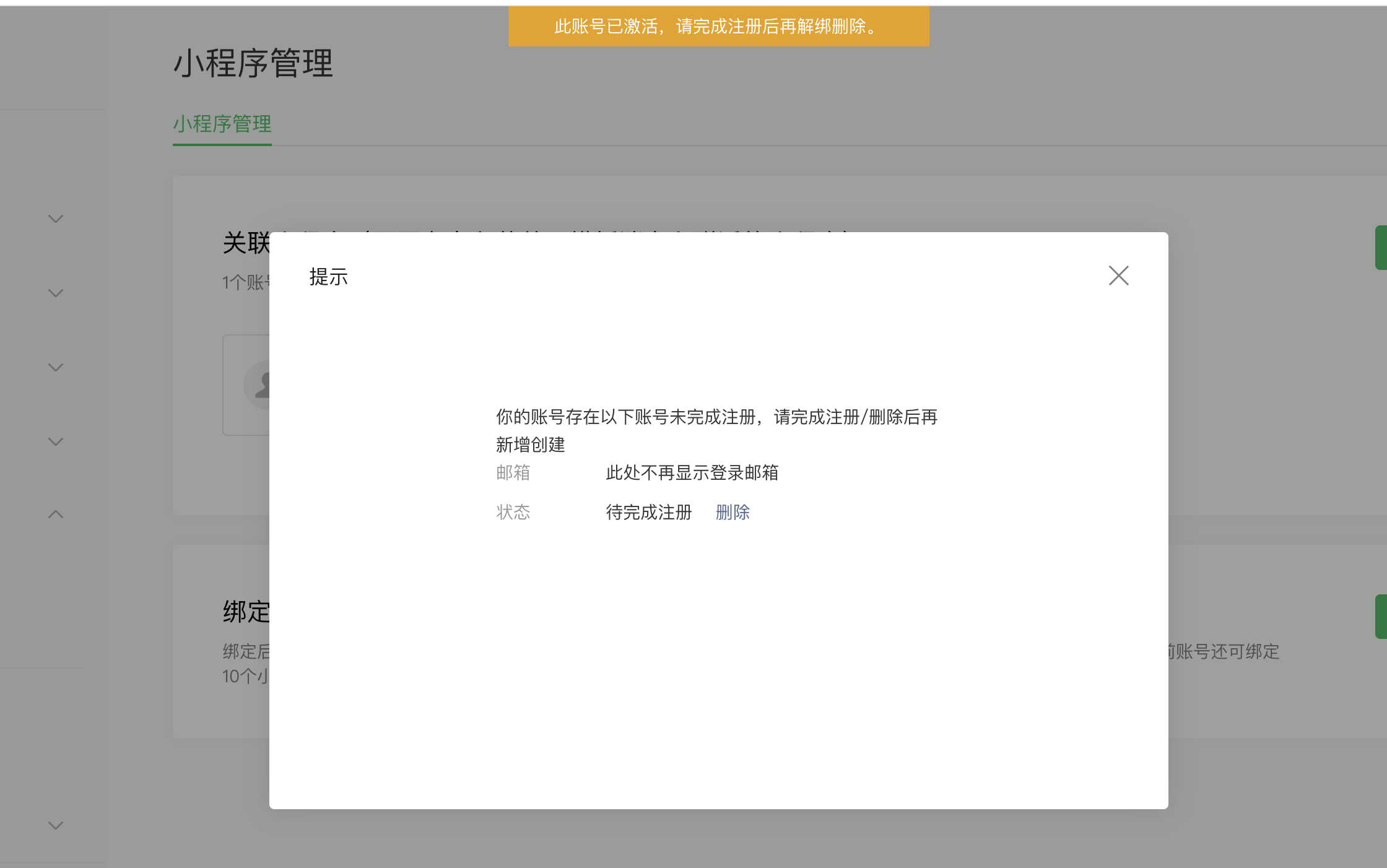 公众号关联小程序时提示存在账号未完成注册,但是我没有设置过小程序的邮箱和密码,无法登录该小程序完成注册,也无法删除这个小程序