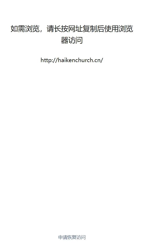你好,经核实,域名haikenchurch.cn下的链接https://wx.haikenchurch.cn/h5/#/pages/home/index存在违规内容,用户可在微信内继续访问/用户可复制网址到外部浏览器打开,请知悉。详细规则请参考《微信外部链接内容管理规范》http://weixin.qq.com/cgi-bin/readtemplate?t=weixin_external_links_content_management_specification以及《针对违规直播等外部链接的进一步治理公告》https://mp.weixin.qq.com/s/lR1nYQOo1uF_qbZeZYnJgA